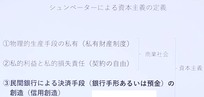 この三つのうち、③の「民間銀行による決済手段の創造」(信用創造)ことが、資本主義の定義の中でも特に重要であり、私有財産制度と契約の自由だけでは資本主義とは言えず、無から貨幣を創造する民間銀行という機関が存在することが資本主義の必須の要件だという。